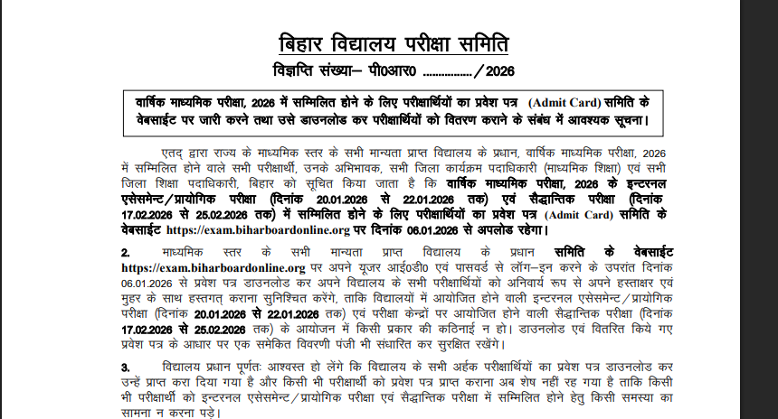 The board has made the Class 10 admit cards accessible only to registered schools, not individual students. School authorities can log in to the official exam portal — exam.biharboardonline.org — using their credentials to download the batch of admit cards for their students. After downloading, principals are responsible for verifying accuracy, signing, stamping, and distributing them to the candidates.