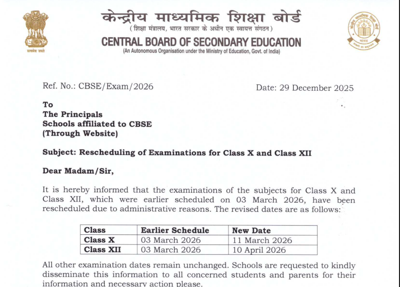 According to the official notification circulated by the CBSE on December 29, 2025, specific papers previously scheduled for March 3 have been rescheduled to new dates, while all other exams in the Class 10 and Class 12 timetable will proceed as initially planned.