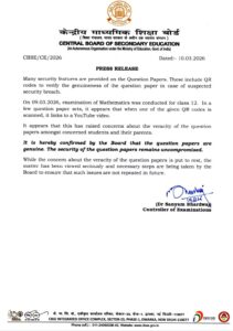 “It is hereby confirmed by the board that the question papers are genuine,” read the official press release by CBSE on its official X handle a day after the CBSE class 12th Maths exam on March 9, 2029. The presence of a QR code on the question paper, which linked to a Youtube music video, had raised concerns about the genuineness of the question paper. However, the latest press release settled all concerns. The statement was signed by the CBSE Controller of Examinations – Dr. Sanyam Bhardwaj.