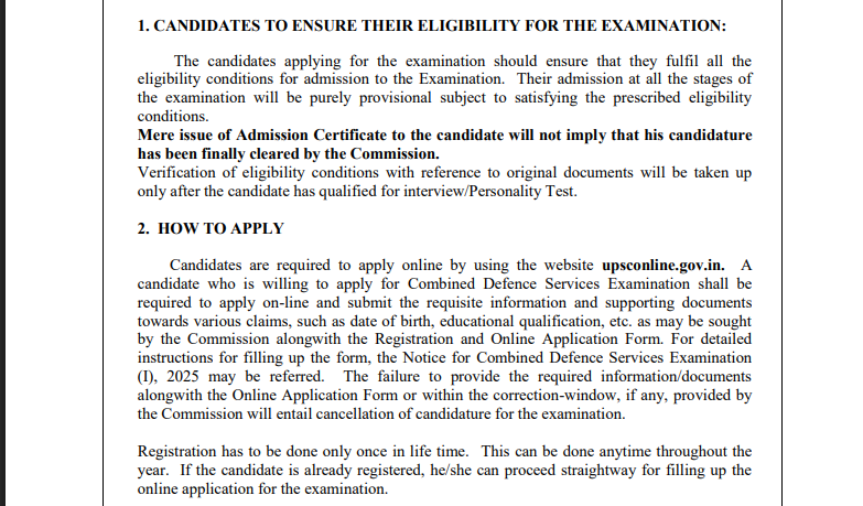 The application process for CDS 1 2026 began on December 10, 2025, with the official notification and online portal activation. Since then, eligible aspirants have been able to log on to upsconline.nic.in, complete the registration, and submit their application forms. The UPSC has made it clear that all applications must be submitted by 6:00 PM on December 30, 2025 — after which the online window will be deactivated.