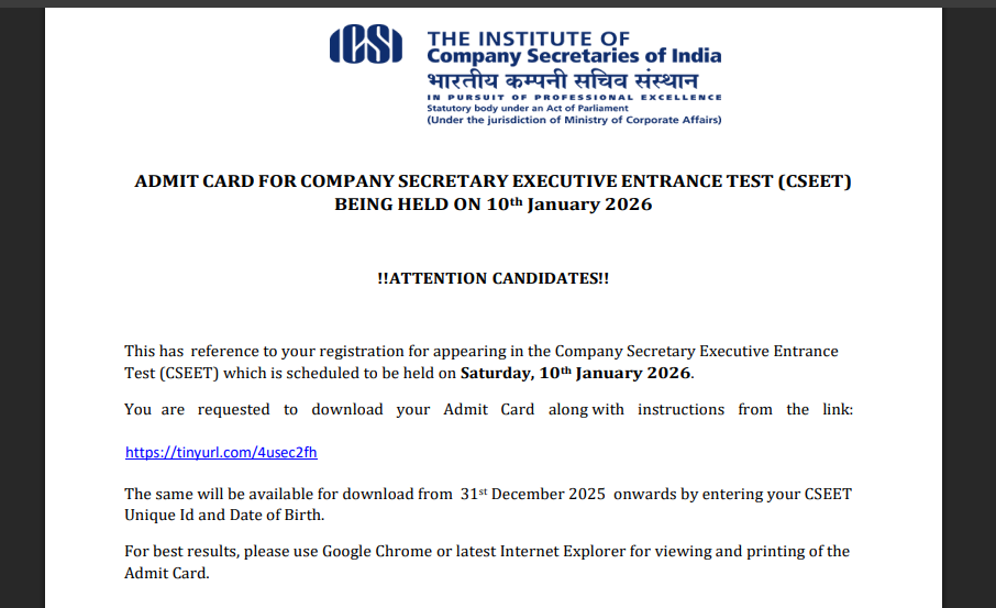 The Institute of Company Secretaries of India (ICSI) has officially released the CSEET 2026 Admit Card for candidates appearing in the January session examination. Students who have registered for the Company Secretary Executive Entrance Test (CSEET) scheduled for January 10, 2026 can now download their hall tickets directly from the official ICSI website.