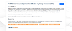 The Post Graduate Diploma in Rehabilitation Psychology is a professional programme aligned with the norms and guidelines of the Rehabilitation Council of India (RCI). It is offered through Open Distance Learning (ODL) mode by the School of Social Sciences at IGNOU.The curriculum emphasises: