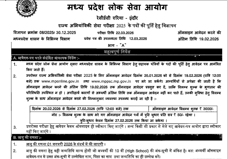 The Madhya Pradesh Public Service Commission (MPPSC) has officially released the much-awaited notification for the State Engineering Service Examination 2025–26, marking the beginning of one of the most significant recruitment drives for engineering graduates in the state. The announcement, published on the MPPSC’s official portal on December 30, 2025, outlines important eligibility criteria, application procedures, the complete timeline of events, and examination details, delivering clarity to aspiring candidates across Madhya Pradesh.