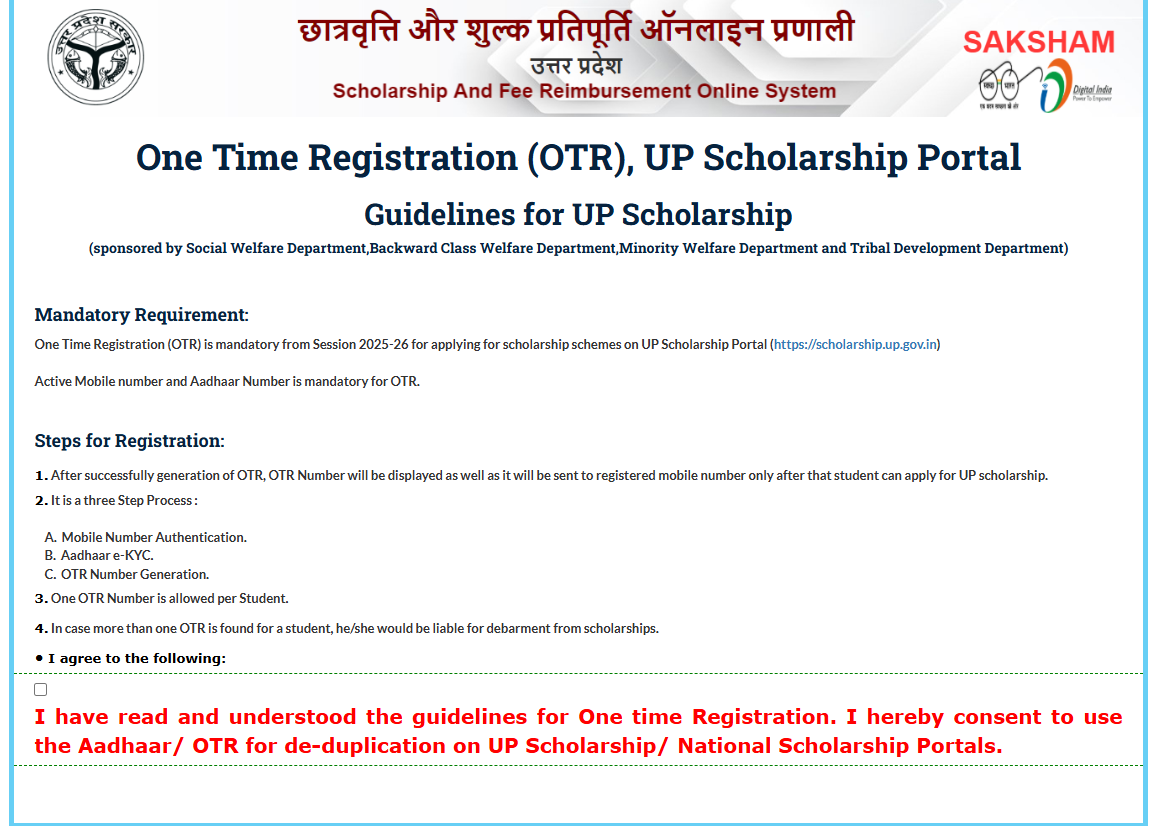 | Pre/Post-Matric OTR Cutoff | October 30, 2025 | Linked to Application | https://scholarship.up.gov.in/RegistrationNew.aspx |